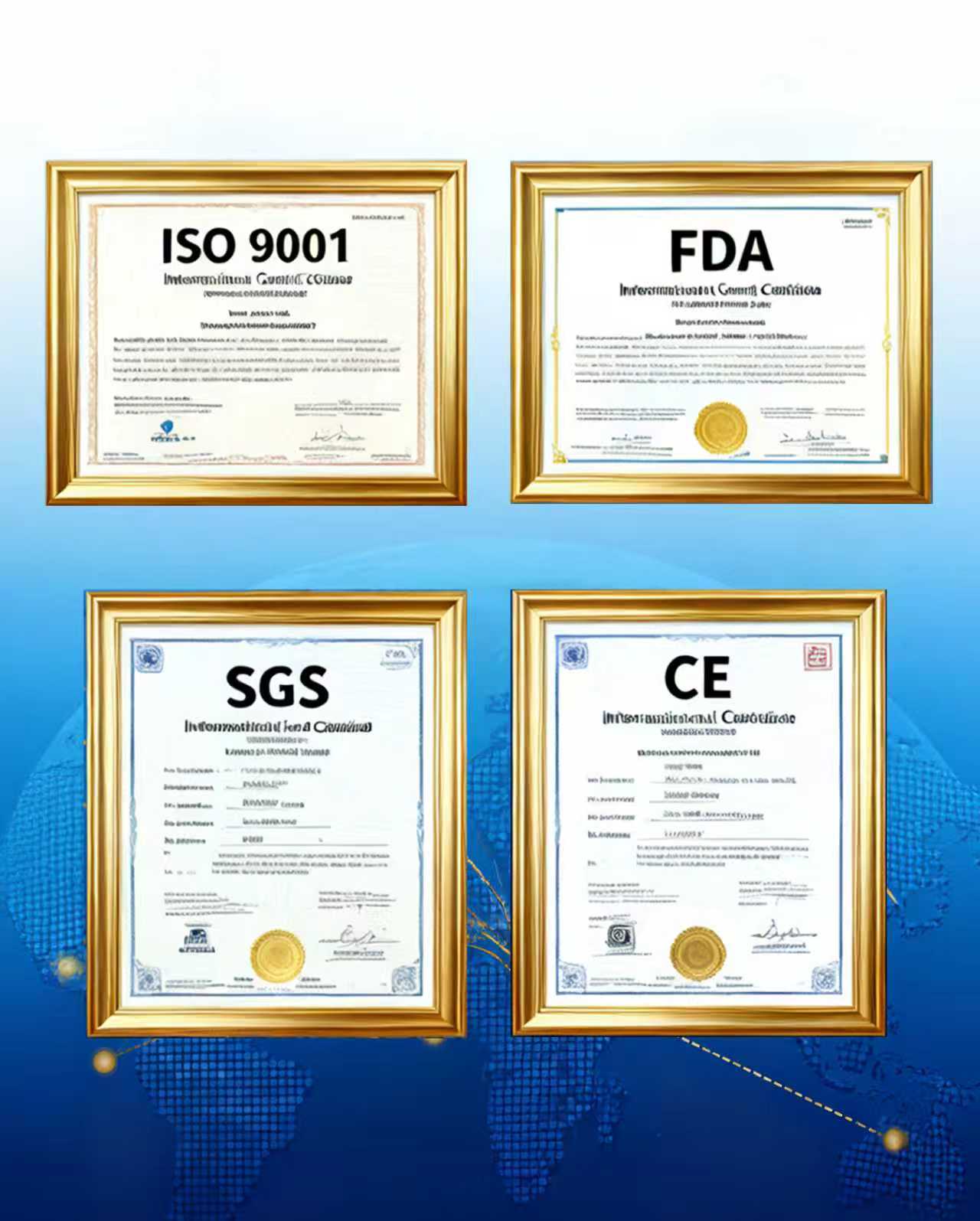 Your Passport to Global Markets Certifications: Comprehensive certifications including ISO 9001, FDA, SGS, and CE for quality management and international market access.