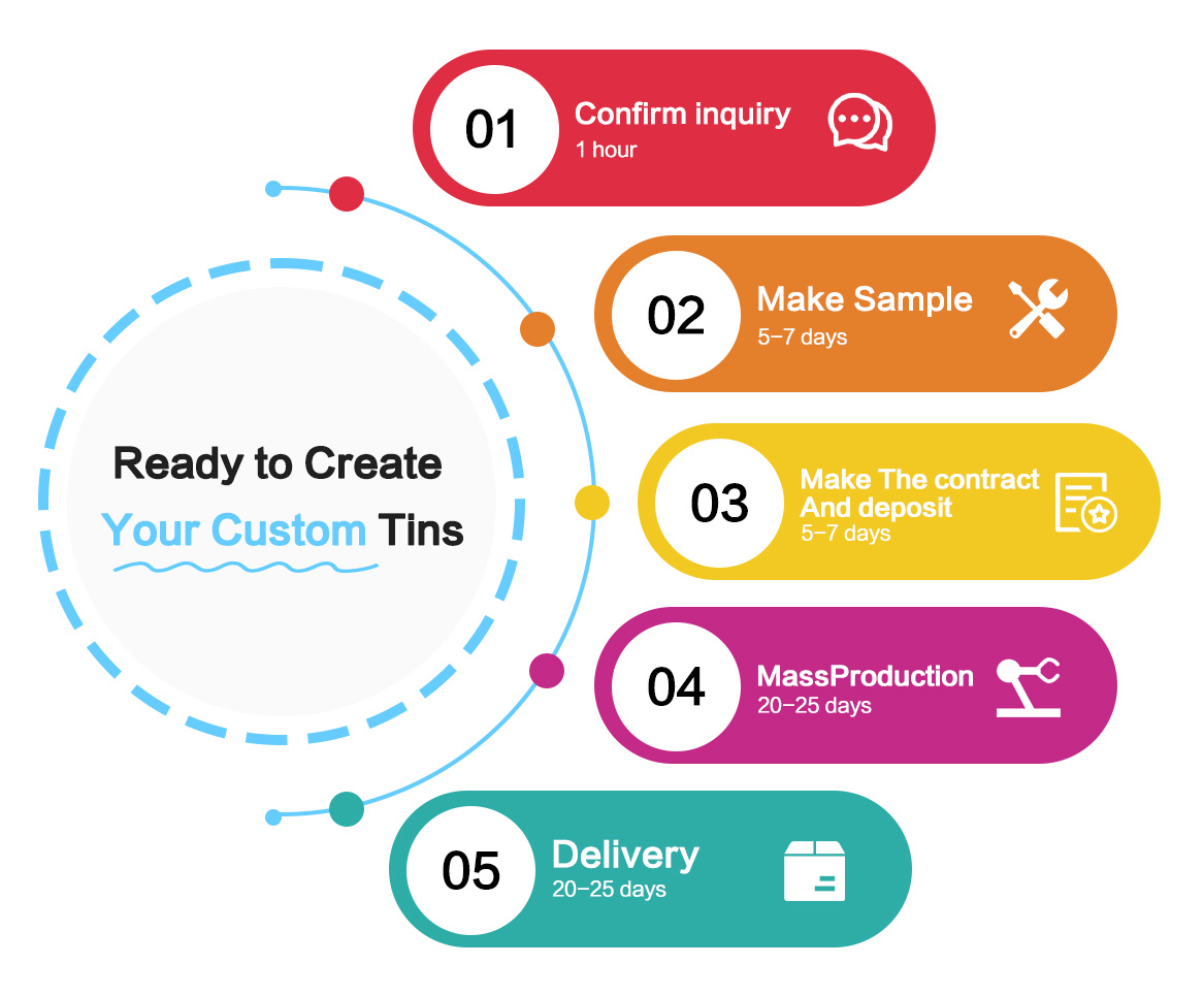 Sure. The process starts with your design and size requirements. We then create samples for your approval before moving into mass production with strict quality control. We’ll guide you through every step to ensure your custom tins meet all specs.